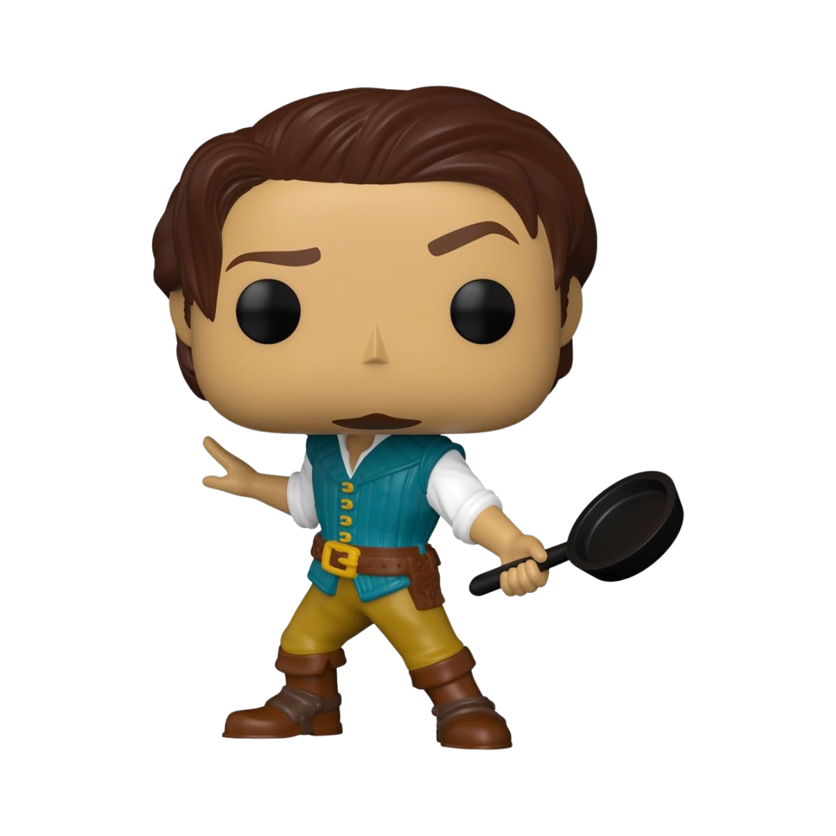 La figura Funko Pop! Flynn (1642) captura a Flynn Rider en su vestimenta de aventurero: botas, chaqueta y, por supuesto, su cabello perfectamente peinado. Sin embargo, el detalle que hace esta figura particularmente especial es la inclusión del sartén de Rapunzel. Este objeto, que originalmente era un arma de defensa cómicamente usada por Rapunzel, se convirtió en un símbolo recurrente del humor y la inesperada dinámica de la película.