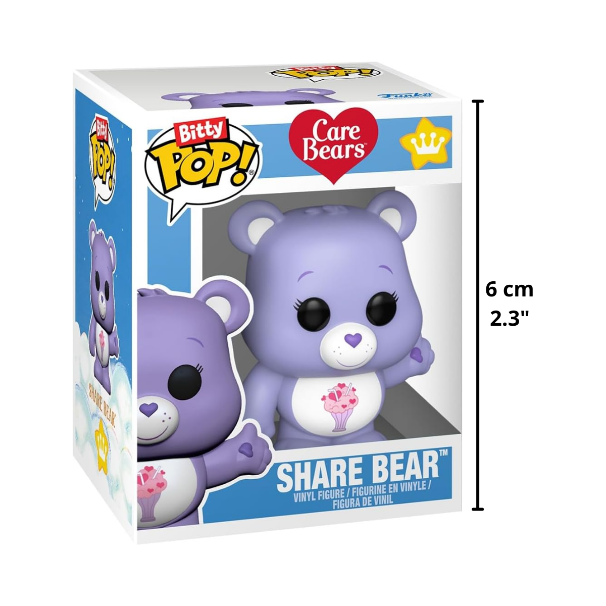 La adorable Share Bear, reconocible al instante por su suave pelaje rosa y el símbolo de un helado rosa y blanco en su barriga, está representada en esta línea “Bitty Pop! Rides” con todo lujo de detalles miniaturizados. La vemos felizmente instalada en los mandos de su Cloud Mobile, el vehículo mágico con forma de nube esponjosa que todos recordamos de las aventuras en la Tierra de los Cuidados.