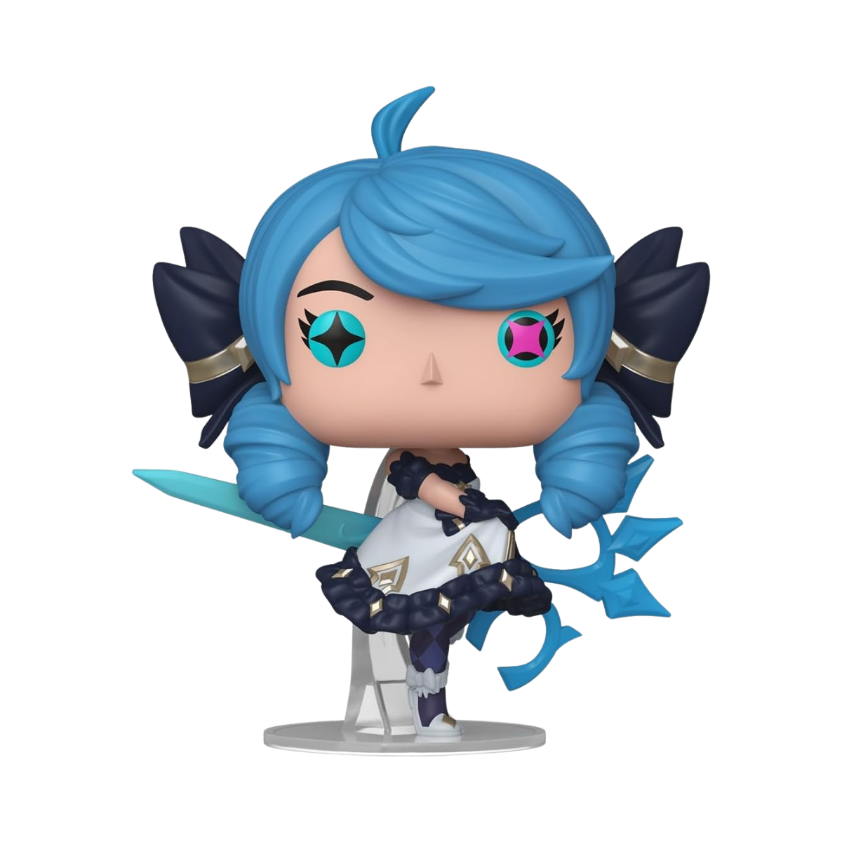 Lo que realmente hace destacar al Funko Pop! número 1135 es el nivel de fidelidad con el modelo original de Riot Games. Gwen luce su icónico vestido azul oscuro con encajes blancos y detalles dorados, recreados con una precisión sorprendente para su tamaño. Sus grandes ojos reflejan la inocencia de su origen, mientras que su postura sugiere que está lista para defenderse en la Grieta del Invocador.