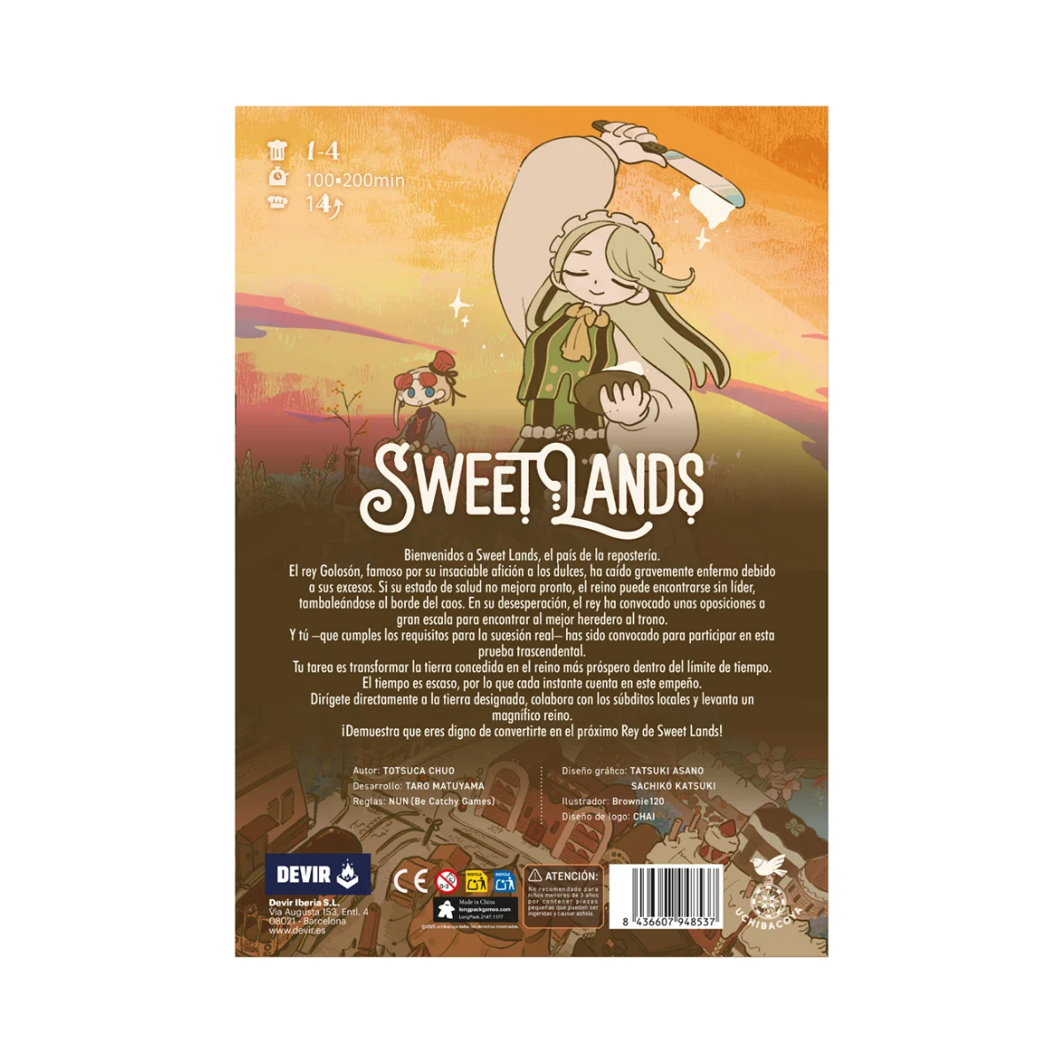 ¡Convierte tu mesa en un reino de confitería y lucha por la corona! Sweet Lands es un eurogame de construcción de ciudades y gestión de recursos donde 1 a 4 jugadores compiten por convertirse en el nuevo gobernante del reino de los dulces. Diseñado por Totsuca Chuo e ilustrado por Tatsuki Asano, incluye 14 personajes asimétricos, más de 200 cartas y 449 componentes de madera. Un juego de nivel avanzado que combina mecánicas profundas con una estética kawaii y una producción de lujo. ¡La partida de 2 horas más dulce que probarás!