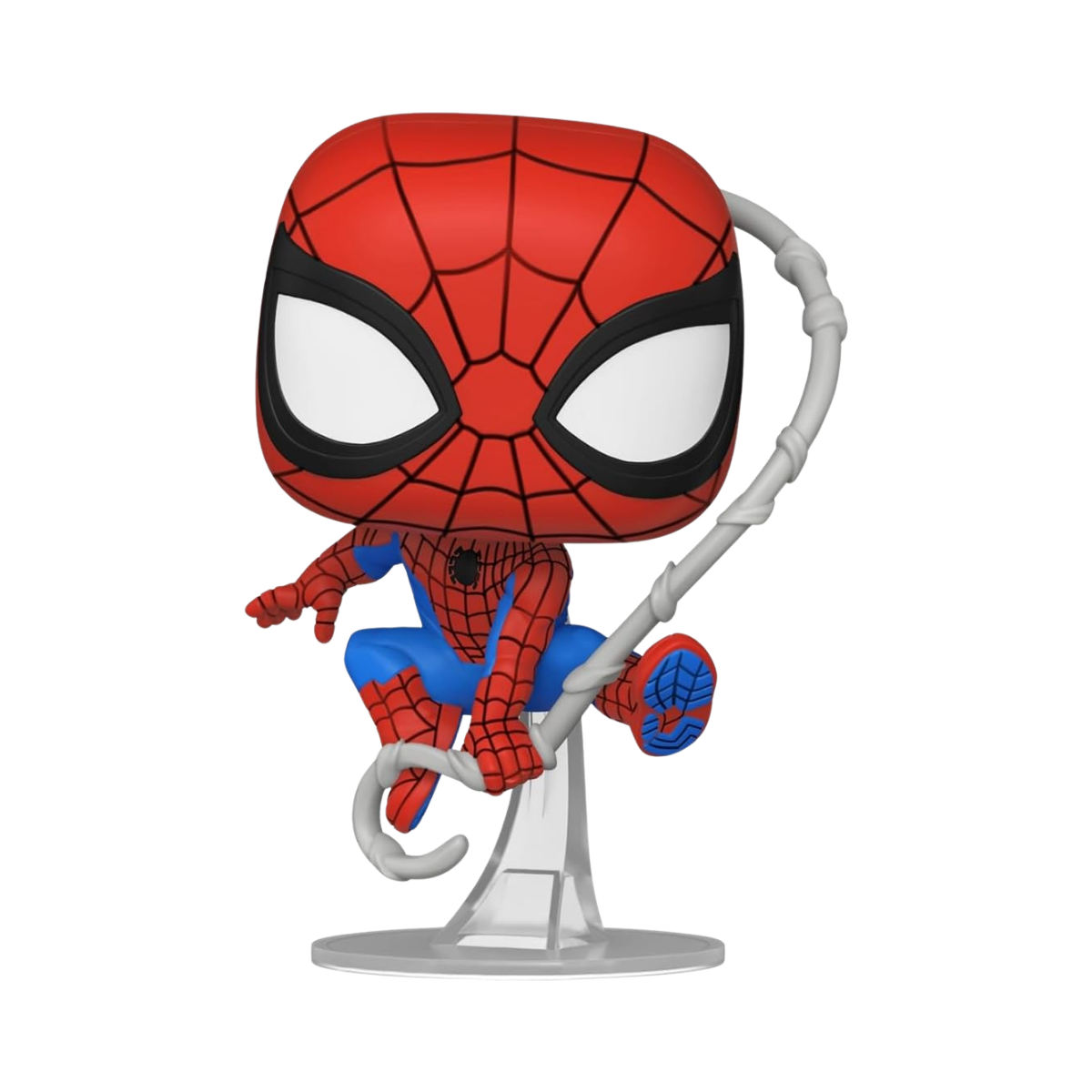 Su traje rojo y azul brilla con colores vibrantes, destacando el icónico emblema de la araña en su pecho y el detallado patro de telaraña que lo define. La expresión de sus ojos blancos y oversized, un sello de la línea Funko, transmite una sensación de alerta y determinación, pero también de esa chispa jovial que hace único al personaje.