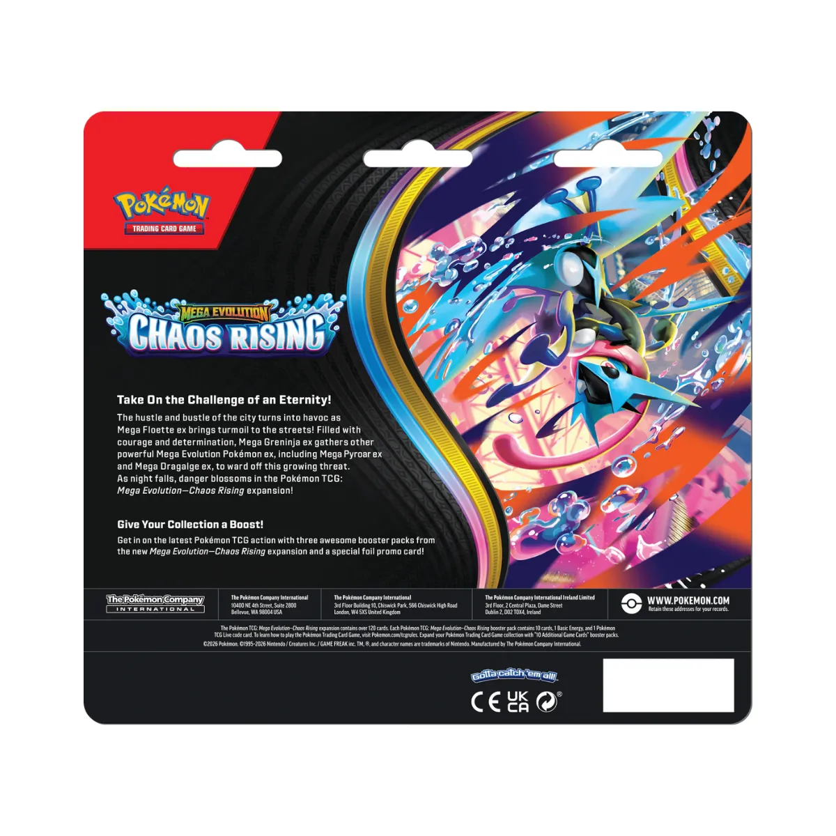 ¡El caos llega a Ciudad Luminalia con el Pokémon TCG: Mega Evolution – Chaos Rising 3-Pack Blister! Disponible a partir del 22 de mayo de 2026, este blister es la forma perfecta de sumergirte en la nueva expansión que enfrenta a Mega Floette ex contra Mega Greninja ex y sus poderosos aliados . Incluye 3 sobres booster de la expansión Chaos Rising y una carta promocional exclusiva que no encontrarás en sobres sueltos. ¡Triplica tus oportunidades de conseguir las nuevas Mega Evoluciones Pokémon ex!